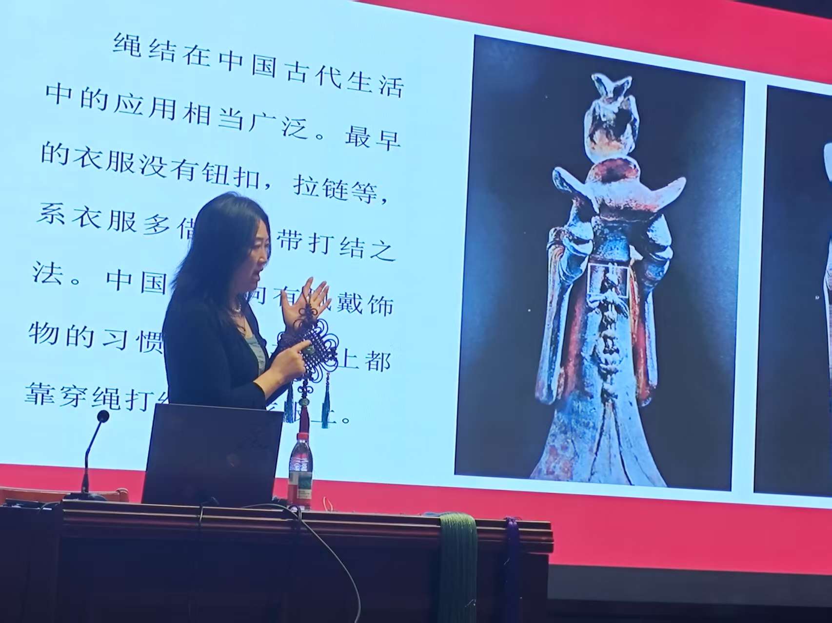 本场讲座围绕“金陵绳结文化”主题,蒋老师从结的诞生、绳结的发展、绳结的用途、绳结的制作以及绳结作品赏析等方面展开详细叙述。蒋老师指出,“上古无文字,结绳以记事”,远古时期,智慧的劳动人民通过绳结来表达对美好生活的追寻,在从事捕鱼,打猎,采集,农业及生活中用于记事。随着社会的发展,结绳也从实用绳结技艺演变成今天精美的艺术品。在互动展示环节,蒋老师手执彩绳,现场展示穿、结、绕、缠、编、抽等多种精湛工艺技法,为同学们带来了别开生面的绳结“文化大餐”。