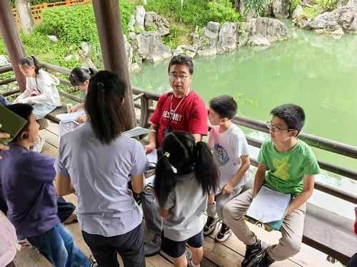 仁和老师首先向孩子们介绍愚园的由来以及园子的总体样貌。园主胡恩燮辞官归隐后,取“大智若愚”之意命名,外园以愚湖为中心,湖光潋滟,柳岸波光;内园假山玲珑,亭台错落,如延青阁可远眺钟山,春晖堂蕴含孝道文化。