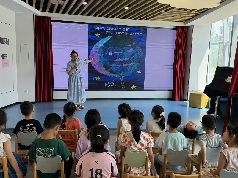 本次读书会精选了国际绘本大师艾瑞·卡尔的经典作品《Papa,please get the moon for me》。绘本凭借温馨动人的故事与充满诗意的插图,为孩子们展现出父爱的温暖。在故事分享环节,老师们用生动活泼的语言,配合丰富的肢体动作,带领孩子们走进这个充满想象力的童话世界。孩子们不仅被精彩的故事情节深深吸引,还在不知不觉中掌握了长短、高矮、大小等基础形容词的英文表达。更令人惊喜的是,绘本巧妙融入了月相变化这一自然现象,让孩子们在听故事的同时,获得了宝贵的自然科学启蒙。