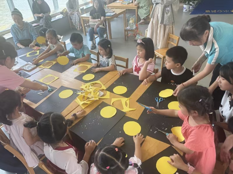 随后是手工制作环节,在老师们的指导下,孩子们的一双双小手认真地裁剪、粘贴,专注地完成属于自己的作品。当看到自己亲手制作的"月亮"在手中闪耀时,孩子们脸上绽放出灿烂的笑容。家长们也积极参与其中,与孩子共同体验创作的乐趣。