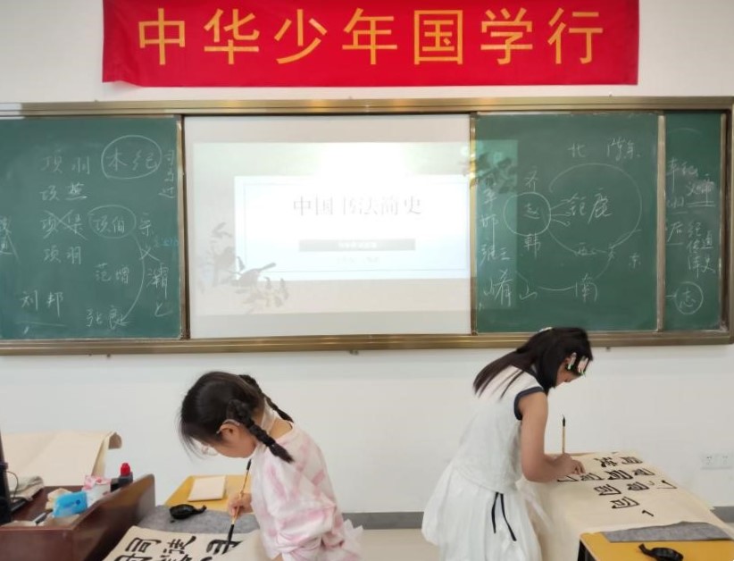 本次课程主要用到的工具有毛笔、毛边纸、作品纸、墨碟、墨、一次性围裙等。课程伊始,老师先给同学们讲解了书法字体的演变,之后又重点讲解了篆书的发展历程,并详细教学示范了“蚕头燕尾”笔画的运笔。之后便进入实操环节,本次课程的临摹字体,是从《乙瑛碑》中选取而出的,但鉴于小朋友们之前都没有接触过隶书,练完几次字体之后,就抓紧时间练习正式作品的内容。同学们写得聚精会神,老师一边巡视一边从旁指导,最后同学们都顺利完成了作品之并题写落款并钤印。