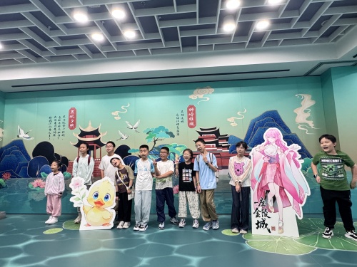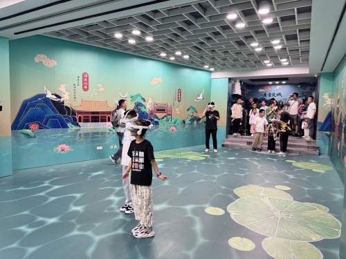 在电教拓展部赵老师的带领下,镇江市图书馆的读者朋友们尽然有序地参观了图书馆的多个特色区域。在文都之窗,读者朋友们了解了南京作为“世界文学之都”的重要意义;在文化长廊,读者朋友们了解了《科学的南京》这部著作。最令他们值得期待的是,金陵图书馆的XR 空间。当读者朋友们走进XR 空间,现实世界的喧嚣悄然隐去,眼前展开的是国风动漫风格的《一座金陵城》。在这场跨越时空的文化对话中,夫子庙的飞檐翘角、天下文枢坊的古朴匾额、大照壁的恢宏气势,都以鲜活的姿态呈现在体验者眼前。科技让古老的金陵城“活”了过来,地域特色的创作与AI 互动装置相映成趣,让孩子们在指尖滑动间触摸到文化的肌理。