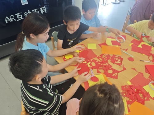 故事结束后,老师们分发了活动材料,红色卡纸、黄色卡纸、胶水、剪刀、铅笔。采用红色卡纸折叠成花瓣状,围绕出繁花造型,象征未来中国发展道路上的蓬勃希望;中央黄色立体五角星,代表中国民族的坚定信仰与光明指引。下方垂坠的红色纸条与锥形装饰,搭配黄色爱心,寓意战士们对人民的深情。