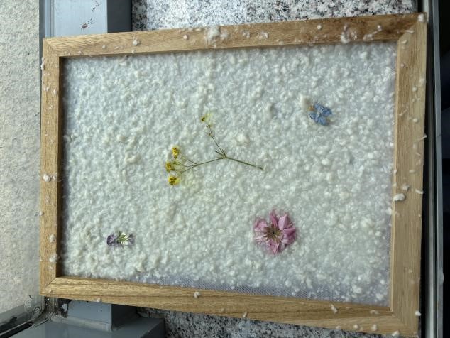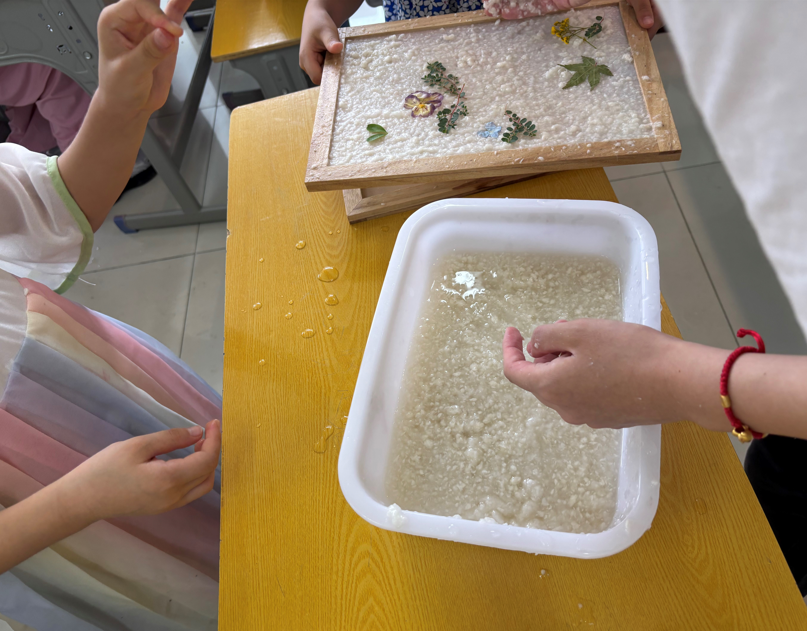 花草纸的制作第一步是将纸浆和粘合剂一起倒入水中,用搅拌器不停搅拌,一定要搅细搅匀,形态成粥状即可;接着,把纸浆垂直放入水中,向下抄起,使纸浆均匀覆盖在纸框上;然后,将纸框放在太阳下暴晒晾干;最后,把晒干的纸浆从框中轻轻取下,一张美丽的花草纸就诞生了。