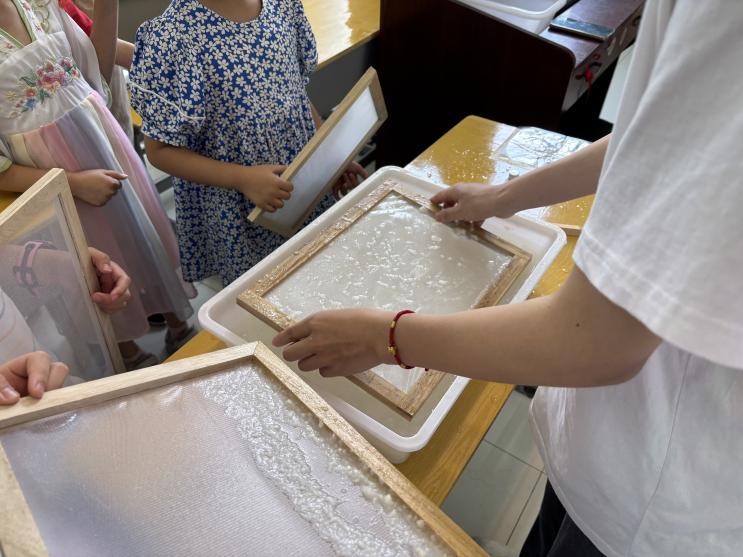 7月19日上午,“非遗学堂”系列课程在金陵图书馆105教室开展了一次关于抄造花草纸的体验活动。