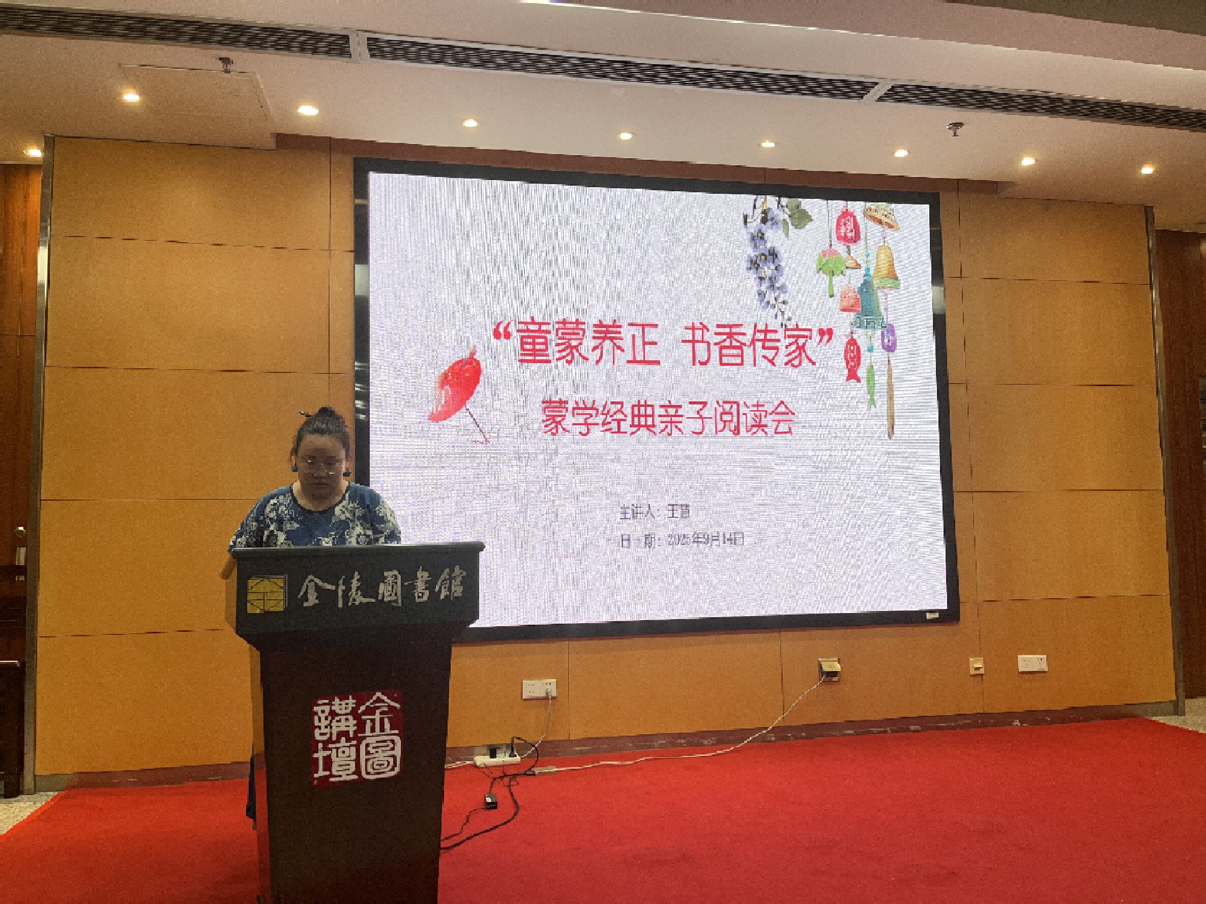 2025年9月14日上午,金陵图书馆一楼多功能厅内传来阵阵清脆悦耳的诵读声。“童蒙养正 书香传家”蒙学经典亲子阅读会正在这里举行。本次活动通过专家讲解、亲子共读和手工体验等多种形式,让参与家庭领略了中华传统蒙学经典的魅力,理解了其中蕴含的教育智慧。