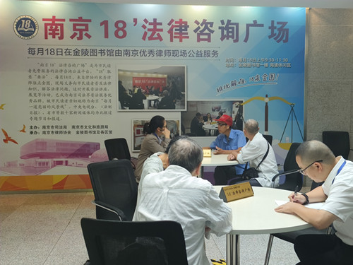 “南京18’法律咨询广场”起始于1994年12月18日,由金陵图书馆与南京市司法局、市律师协会共同创建,是一项常年面向所有市民的公益法律咨询服务。每月18日上午,南京市律师协会从全市各律师事务所选派优秀律师前来义务驻点,解答市民提出的法律问题。