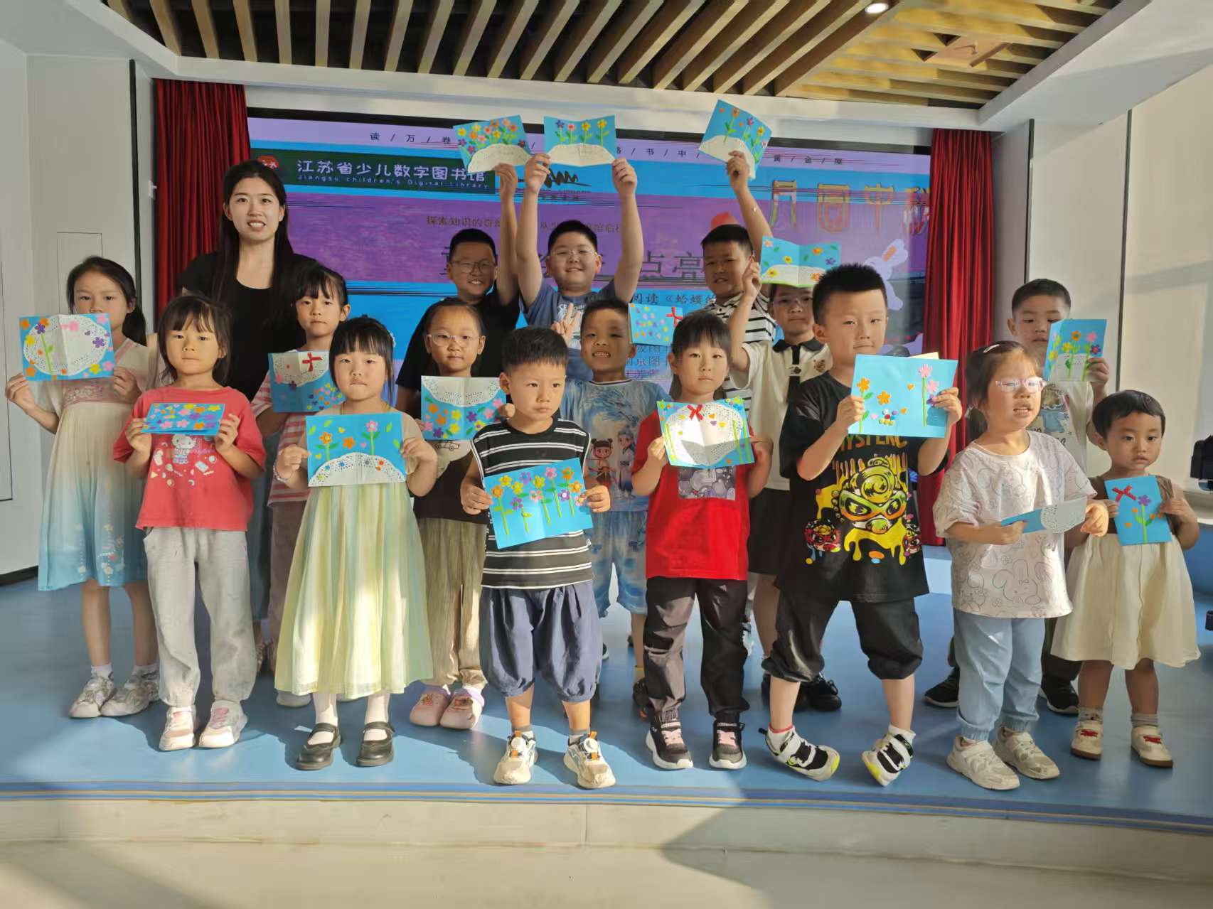 最后,在成品展示环节,孩子们拿着自己制作的明信片,和老师一起拍照留念。孩子们的欢声笑语回荡在小舞台上,为本次绘本阅读主题活动画上了圆满的句号。