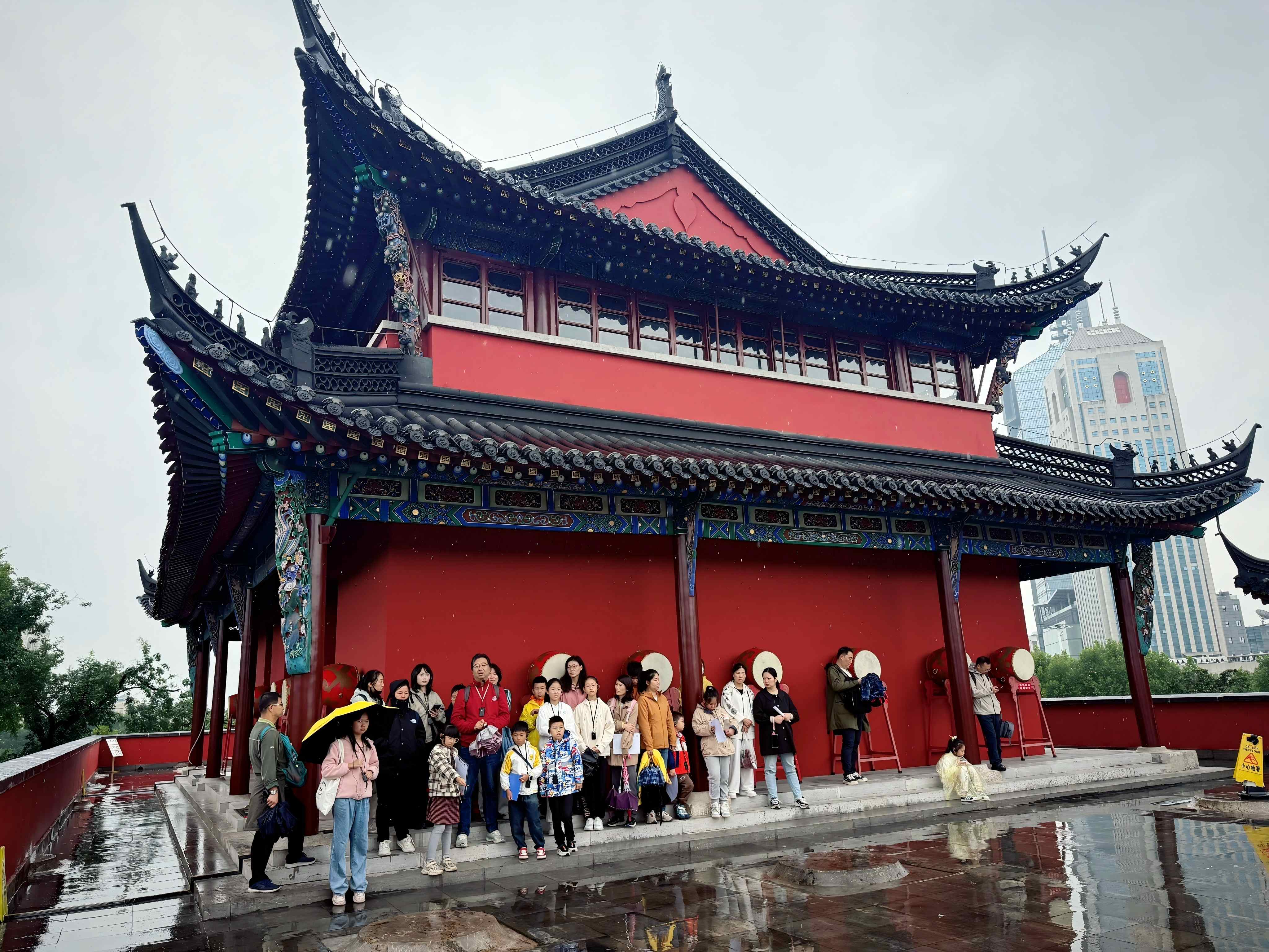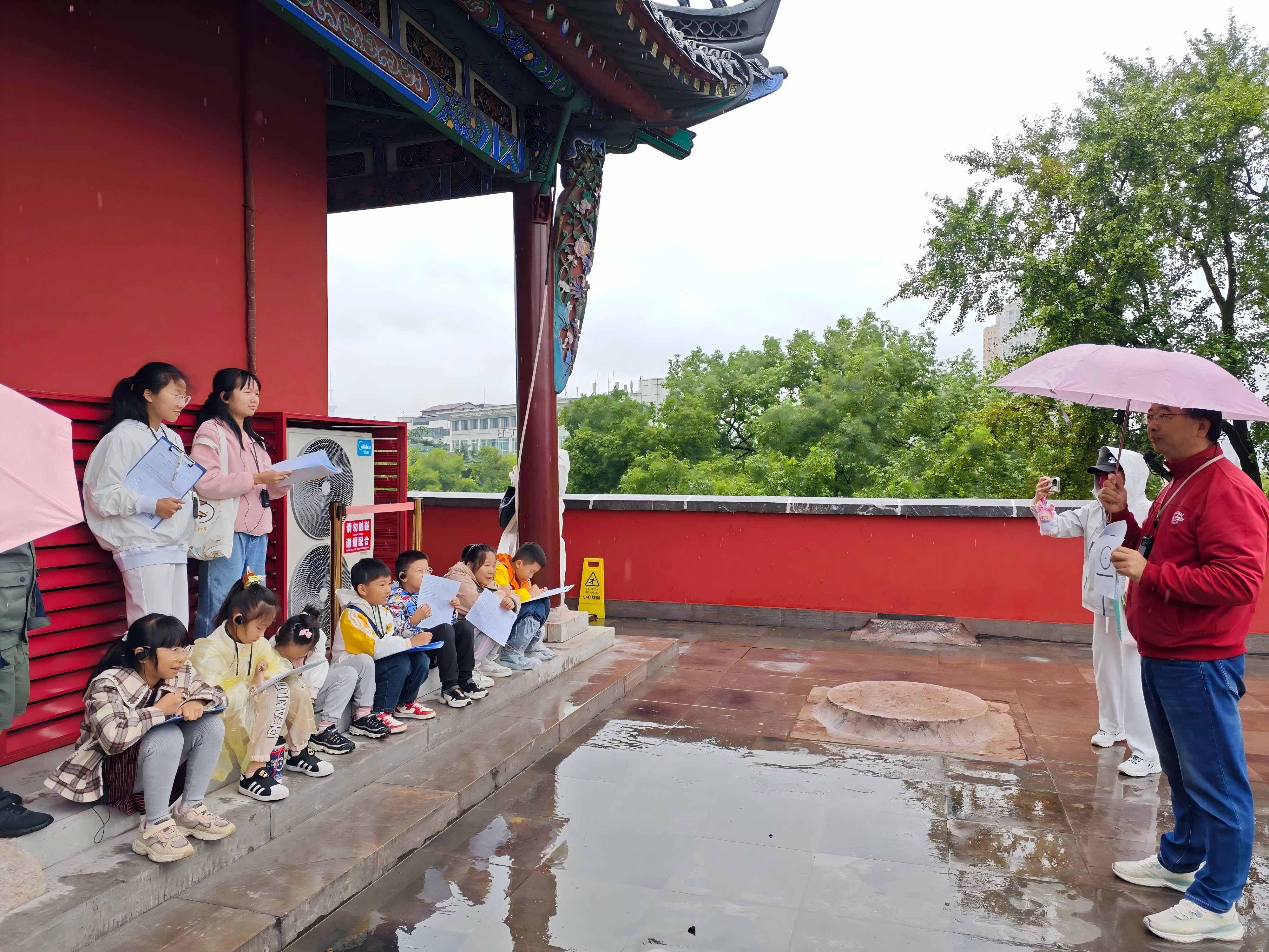 活动伊始,仁和老师带领同学们从城台左侧拱门登入青石台阶,来到视野开阔的城楼。秋日的绵绵细雨带来一丝微凉,而同学们的学习热情依旧旺盛。接着,仁和老师向同学们介绍鼓楼及其周边建筑设施的由来。南京鼓楼既是历史上的南京市中心,也是明清两代南京的报时中心,古时以“晨钟暮鼓”区分昼夜,清末机械钟表逐渐普及,民国时期以紫金山天文台发电报报时为基准,统一了中国五个时区。仁和老师还向同学们讲述了鼓楼周边的鼓楼医院、金陵大学旧址等的故事,这些有着百年历史的建筑设施见证了南京的历史变迁与文教发展。
