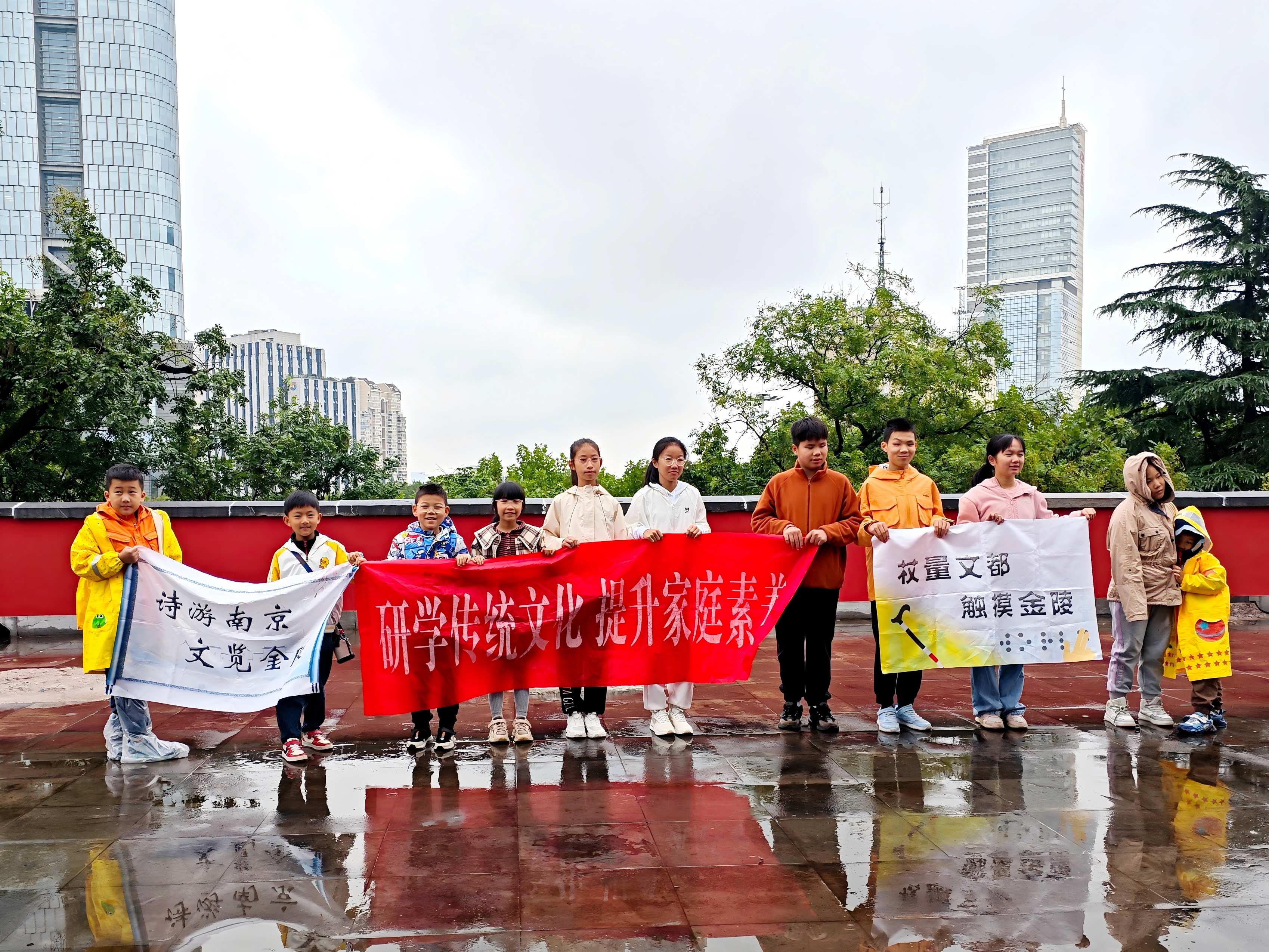 最后,同学们在城楼的石阶上席地而坐,望着对面高耸入云的摩天大楼——紫峰大厦,开始了诗词赏析的环节。老师带着同学们赏析了四首古诗: