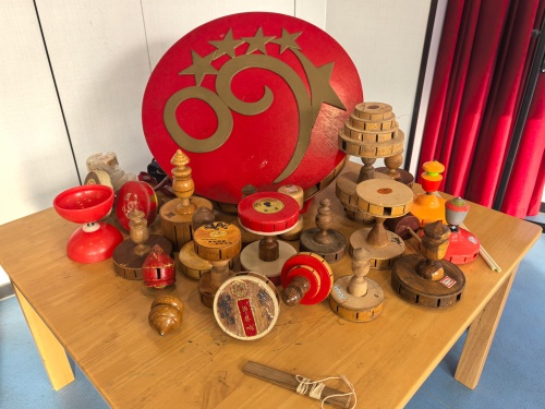 空竹的形制也从传统的竹木制品,逐步演变为半塑木、全塑料,直至2006年南京首创的“轴承空竹”,大大提升了技艺表现力与学习效率。赵凯老师家中收藏了数十种空竹,最大的一款竹制空竹直径达60厘米,是为庆祝新中国成立60周年特地定制的。