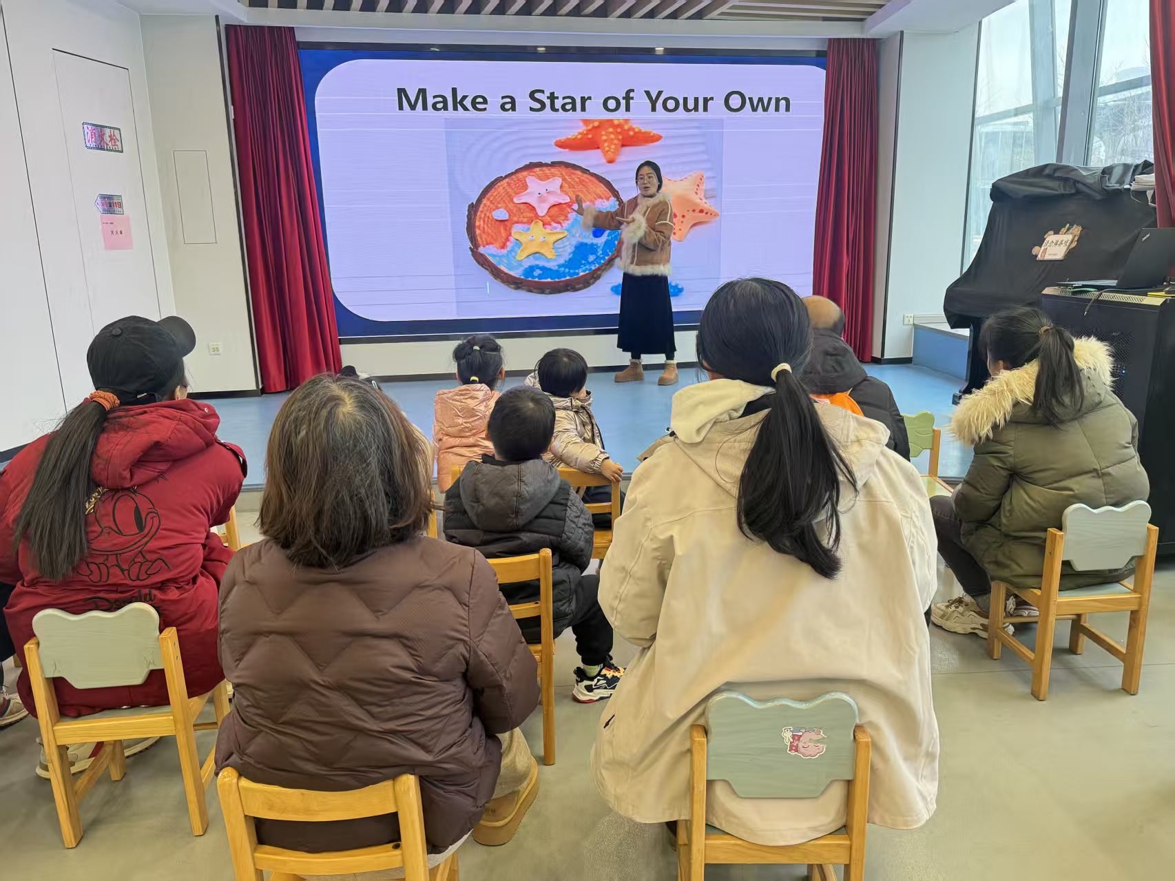 故事分享结束后,活动进入了充满创意的手工环节——“Make a star of your own”。在老师的指导下,孩子们和家长利用笔、黏土等材料,认真地绘画、拼贴、装饰,全心投入地制作那颗独一无二的、专属于自己的小星星。他们发挥天马行空的想象力,让手中的星星焕发出各异的光彩。