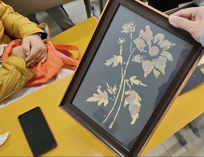 3月21日上午,“非遗学堂”系列课程在105教室开展了一次非遗金箔画DIY的手工体验活动。