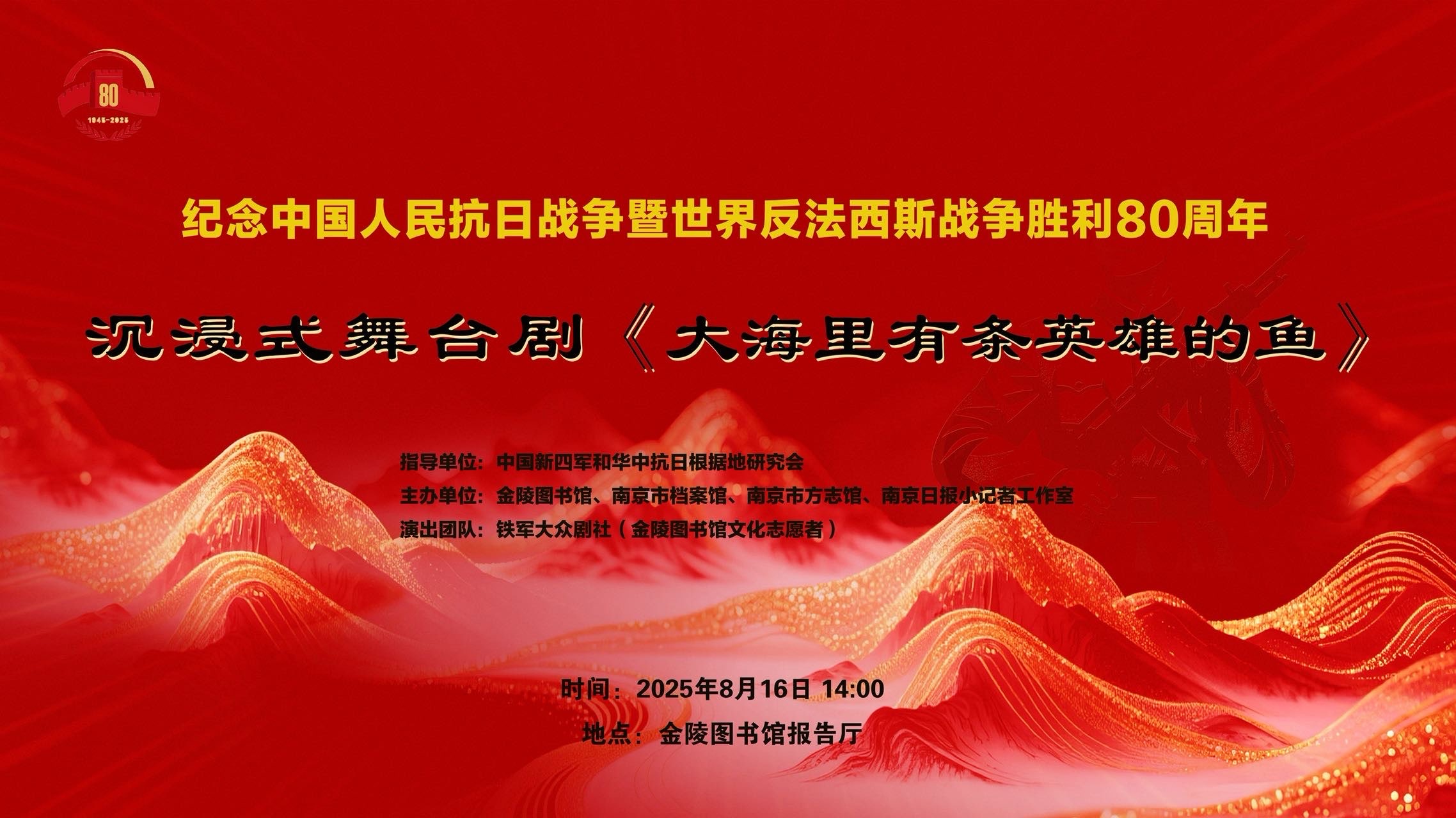 沉浸式舞台剧《大海里有条英雄的鱼》根据真实历史改编,由中国新四军和华中抗日根据地研究会指导,金陵图书馆、南京市档案馆、南京市方志馆、南京日报小记者工作室联合主办,铁军大众剧社的文化志愿者们演出,讲述了1945年在江苏高邮进行的三垛河口伏击战中壮烈牺牲的抗日英雄海有鱼烈士的成长故事,展现了英雄所在部队的精神风貌。据悉,本剧主创团队多为复转军人,他们将对革命先烈的崇敬之心和对人民军队的深厚感情都融入在了表演之中。
