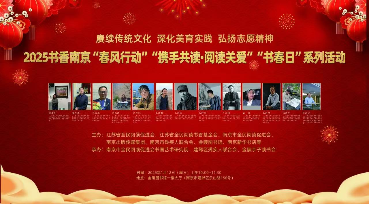 为全面落实习近平总书记关于推动全民阅读、建设书香社会的重要论述和视察江苏重要指示精神,加强优秀传统文化保护传承和创新发展,切实关爱以残障人士、民工子弟、留守儿童为代表的弱势群体,赓续传统文化,深化美育实践,弘扬志愿精神,多家单位共同举办2025书香南京“春风行动”“携手共读·阅读关爱”“书春日”系列活动。活动将邀请十余位书法名家现场挥毫,免费为市民读者撰写春联、“福”字等书法作品,用文化为群众服务,用书香为百姓送福,用最诚挚的心意,迎接新春的到来。