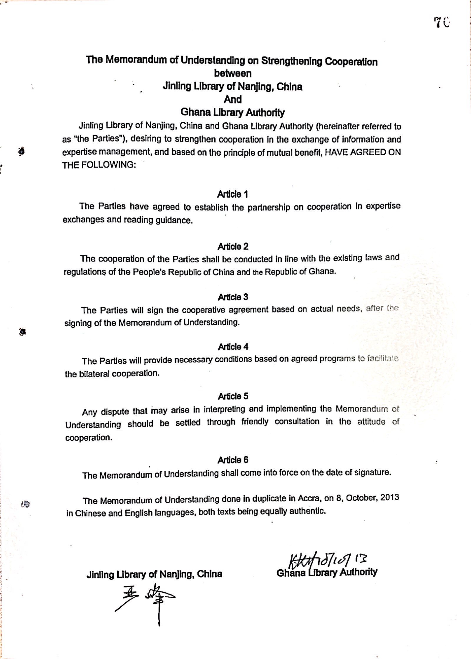 附:《中国南京金陵图书馆和加纳图书馆委员会关于加强相互合作的谅解备忘录》(中英版)