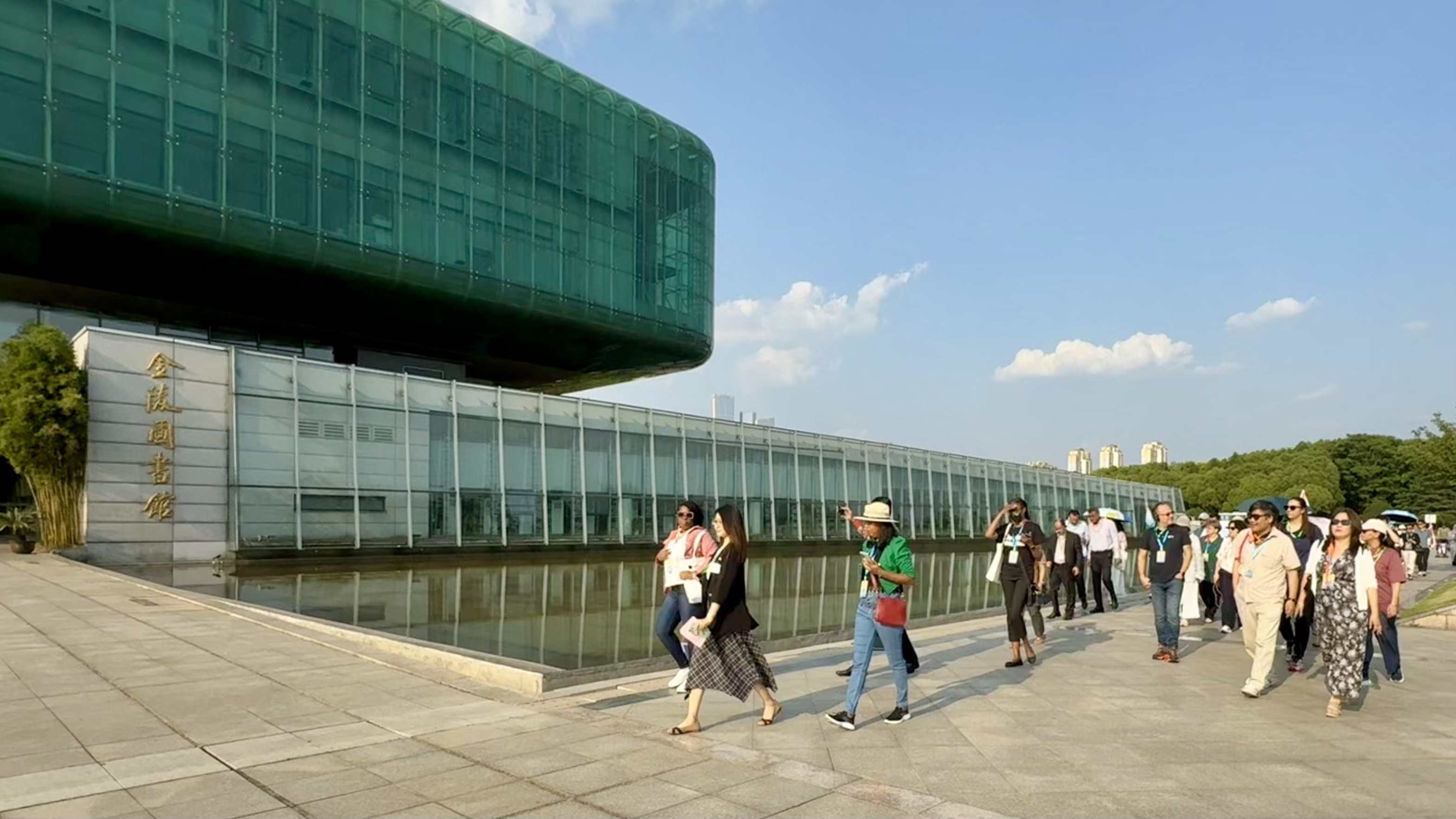 29日下午,参会代表一行莅临金陵图书馆参观调研,先后在八九零空间、阅·荐空间、童·阅空间等新型特色服务空间驻足考察,在馆员的讲解和引导下,各国参会代表认真观摩了金图为纪念郑和下西洋620周年特别策划的“海丝印记·南京遗迹”专题展以及“中国图书之窗”展示墙、“一带一路”馆藏文献及信息摘编展示区等,了解了金图对外交流的发展历程以及在“一带一路”主题文化展示方面所做的系列工作。在金图创新打造的XR数字阅读区,LBE VR等技术让古籍中的金陵盛景跃然眼前,代表们沉浸式体验了科技与文化交融的魅力,流连忘返。