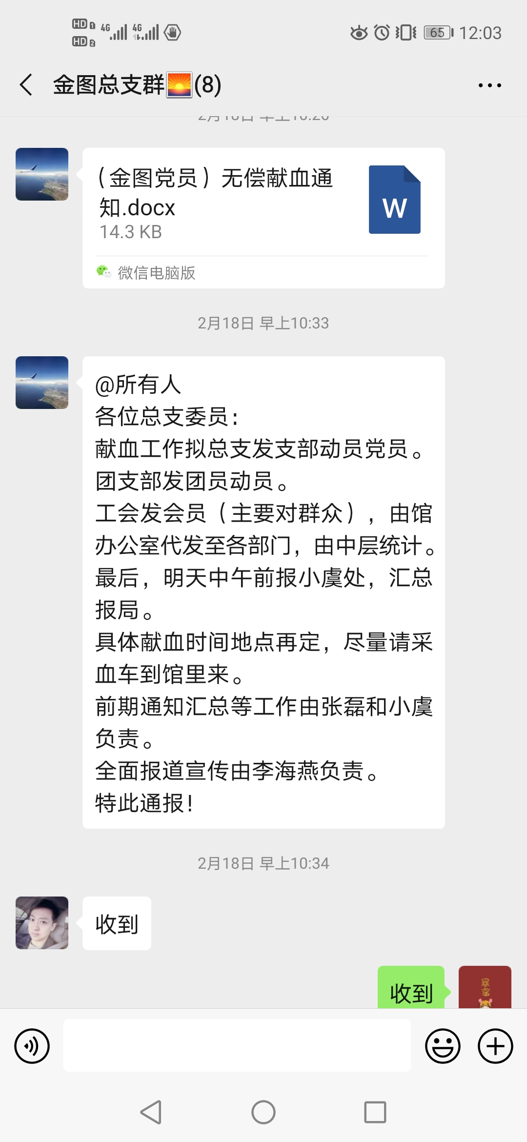 发出的献血倡议通知得到了图书馆广大党员、团员和群众的大力支持和积极响应。一句句“我报名!”“有我一个。”“我再献一次。”的线上接力,用热情和态度展现了图书馆人的责任和担当。此次献血是在发生疫情的特殊时期,对献血有许多诸如疑似接触、小区疫情、时间限制等额外要求。特别一提的是,馆里已有部分党员同志在疫情刚发生时,已默默无闻主动献过了血。这些原因限制了许多同志的报名。在不到一天的时间里,还是有33名同志成功报了名。其中23名党员、7名团员、3名群众。没有报名成功的一些同志也纷纷表示,等符合了时间限制等条件,自己再前往献血点去献血。