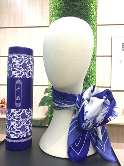 此款丝巾是为扬州举办的第十一届中国海洋论坛专门定制的一款具有纪念意义的丝巾,画面主要根据一带一路概念,外围是经过的主要城市和地区及代表文化元素,中间是“丝绸之路”骆驼元素与“海上丝绸之路”的圆形样式表示主题思想——融(和谐、平等、互助的精神内涵)。