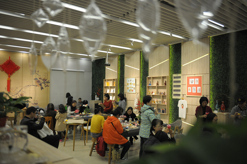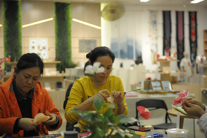 两位艺术导师首先讲解了此次仿真花DIY的主要材料——皱纹纸的特殊性能及塑造力,让大家对手中的材料和配件有了深入了解和全局规划。在此基础上,妈妈们开始在导师的逐步指引下,动手制作花心、花蕊、花瓣、茎叶,颜色、搭配、造型全由妈妈们自行设计。简单、雅致、不失格调,在近两个小时的“妈妈学堂”中,她们用双手诉说着自己的美学态度。金图文创中心温馨的环境布置和贴心的茶点安排,更让妈妈们如在自家般舒适,跳出日常生活的琐碎,摆脱身不由己的节奏,尽情享受金陵图书馆带给她们的完美午后。