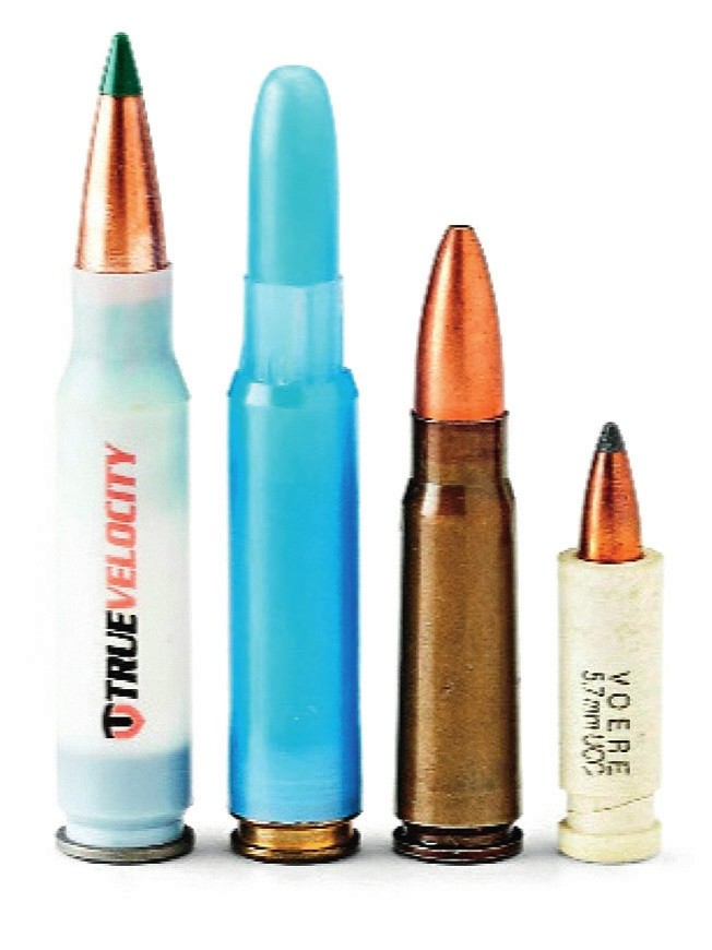 弹壳材质创新主要集中于步枪弹以减重降本。自左至右依次为:True Velocity的聚合物弹壳枪弹、带黄铜底缘的聚合物训练弹、俄罗斯钢壳弹和5.7mm无壳弹