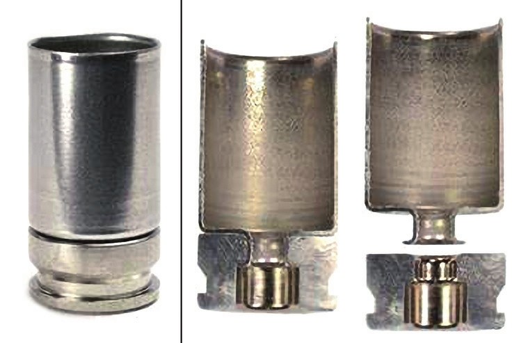 2017年,Shell Shock Technologies公司推出了革命性的两段式NAS3弹壳设计。该设计将光滑的不锈钢弹壳主体与独立底座相结合:步枪弹壳采用不锈钢底座,手枪弹壳则选用铝质底座。这种创新结构使得手枪弹弹壳质量比传统黄铜材质减轻50%,同时具备更高的结构强度,并宣称可实现复装。由于该设计属于专利产品,目前市面上采用这种弹壳的弹并不常见,常见的样品主要来自小型弹药制造商推出的特种弹药,例如Fenix弹药公司的Match Grade系列——专门设计以满足USPSA威力因数(Power Factor)标准。尽管Shell Shock Technologies公司全力论证其NAS3弹壳性能超越传统黄铜弹壳,但就大多数人的体验而言,人们尚未完全信服,更何况它们的价格比黄铜弹更昂贵!