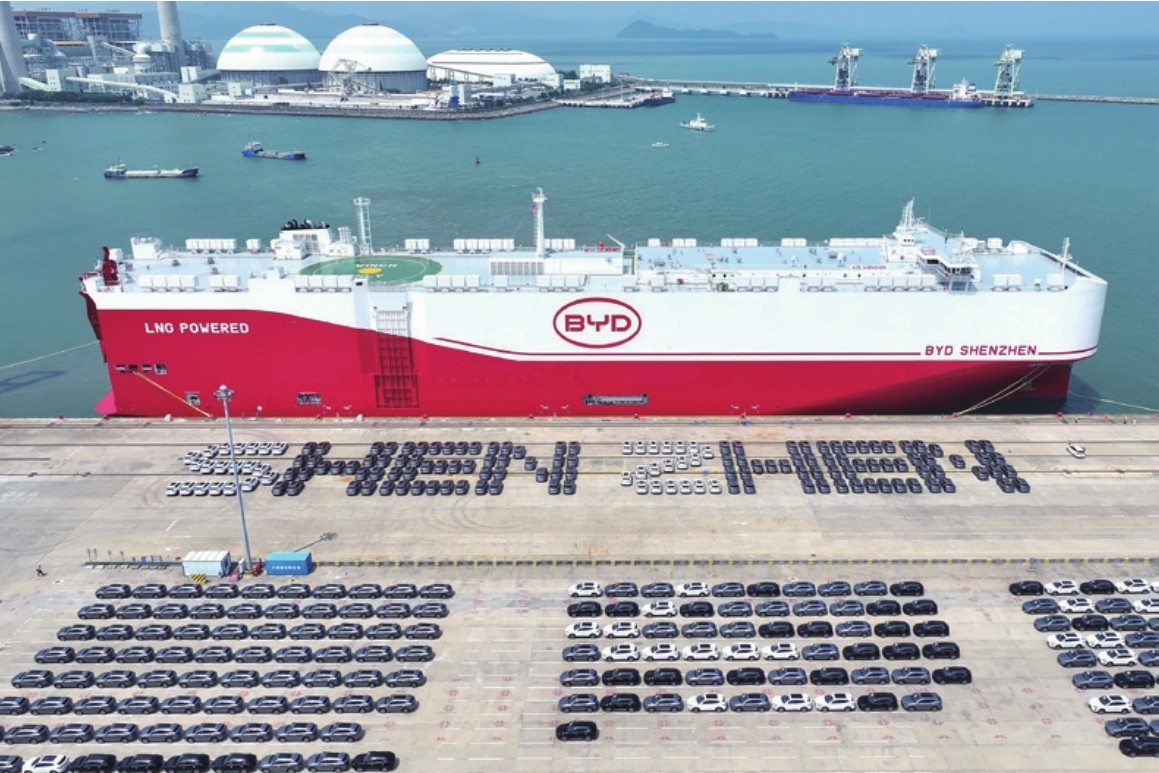 2025年7月8日,广东汕尾,深汕特别合作区,即将驶往欧洲的比亚迪“深圳号”滚装船在深圳小漠国际物流港装载新能源汽车。